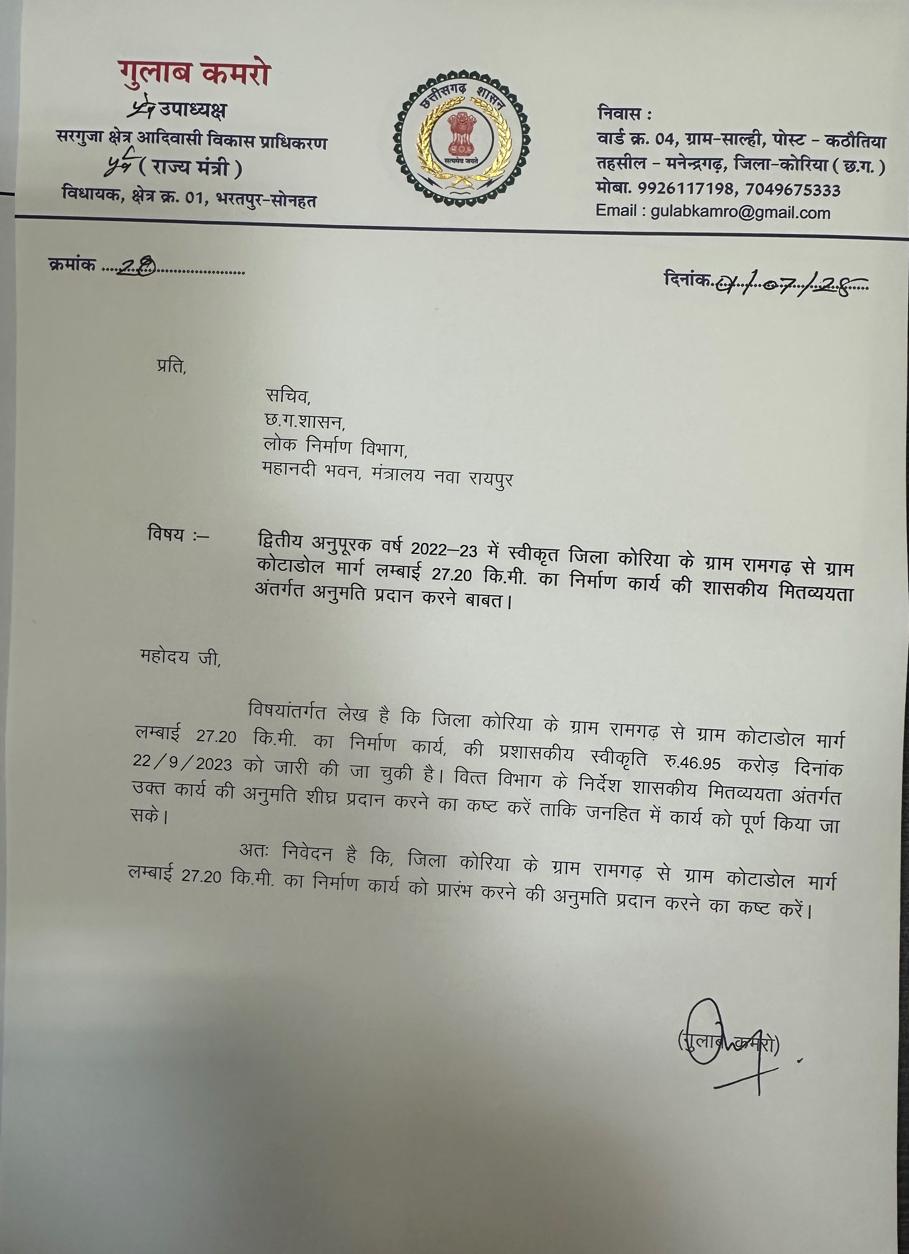 कोरिया जिले में 46.95 करोड़ की लागत से बनने वाली सड़क निर्माण को शीघ्र स्वीकृति देने की मांग। पूर्व विधायक गुलाब कमरो ने लोक निर्माण विभाग सचिव को लिखा पत्र, जनहित में जल्द कार्य शुरू करने की अपील