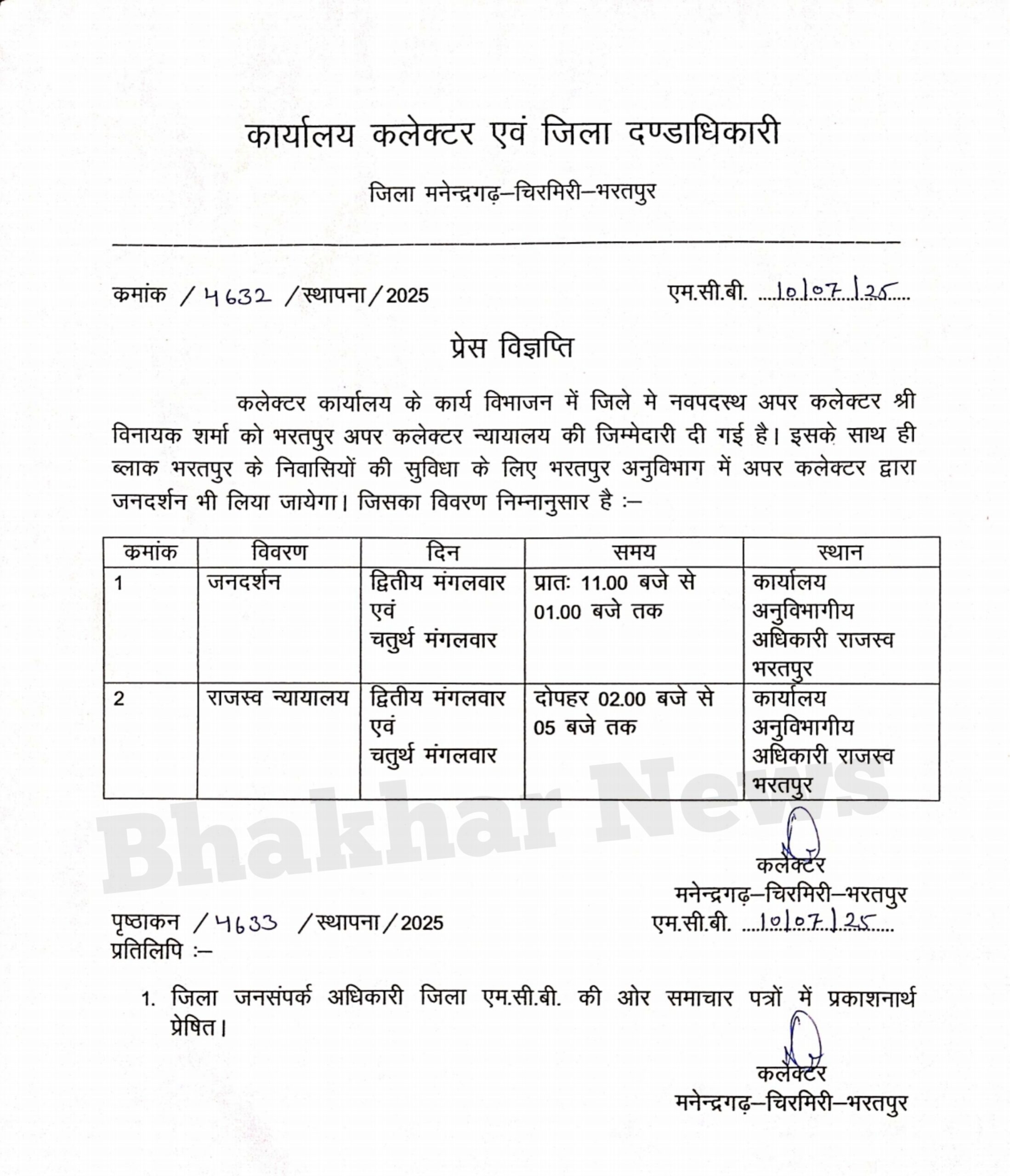 भरतपुर को मिली नई सौगात अब वही होगा न्यायालय और जनदर्शन अपर कलेक्टर विनायक शर्मा को सौंपी गई जिम्मेदारी