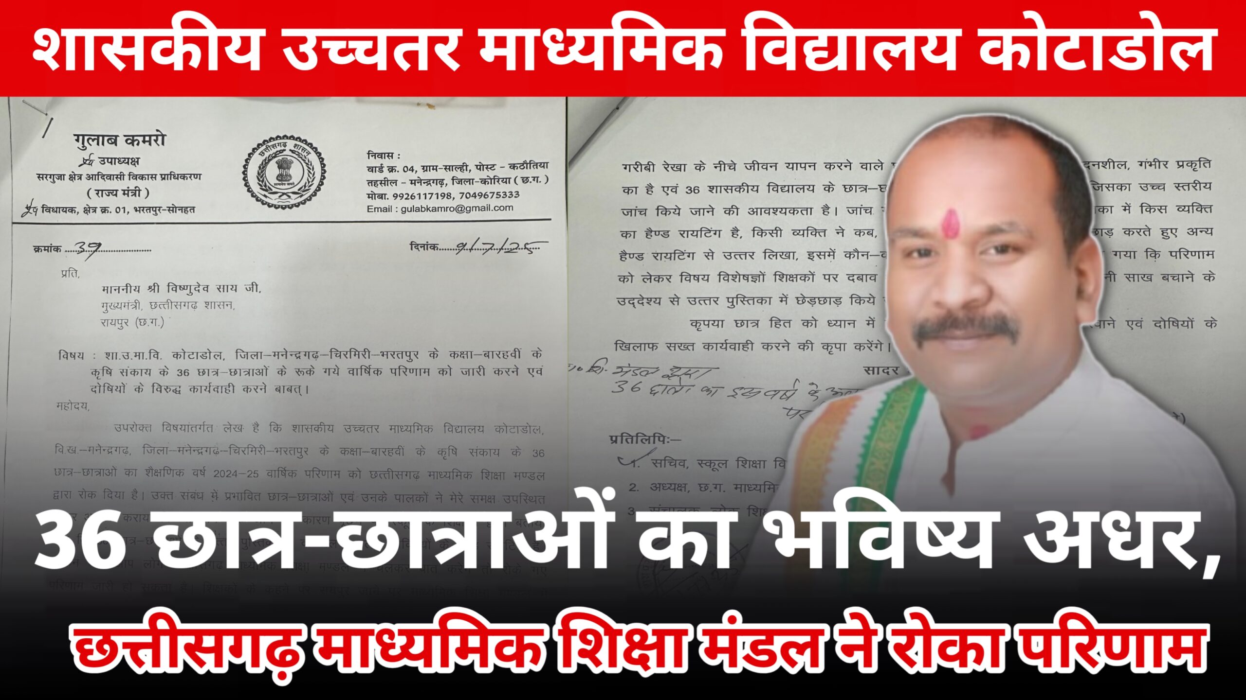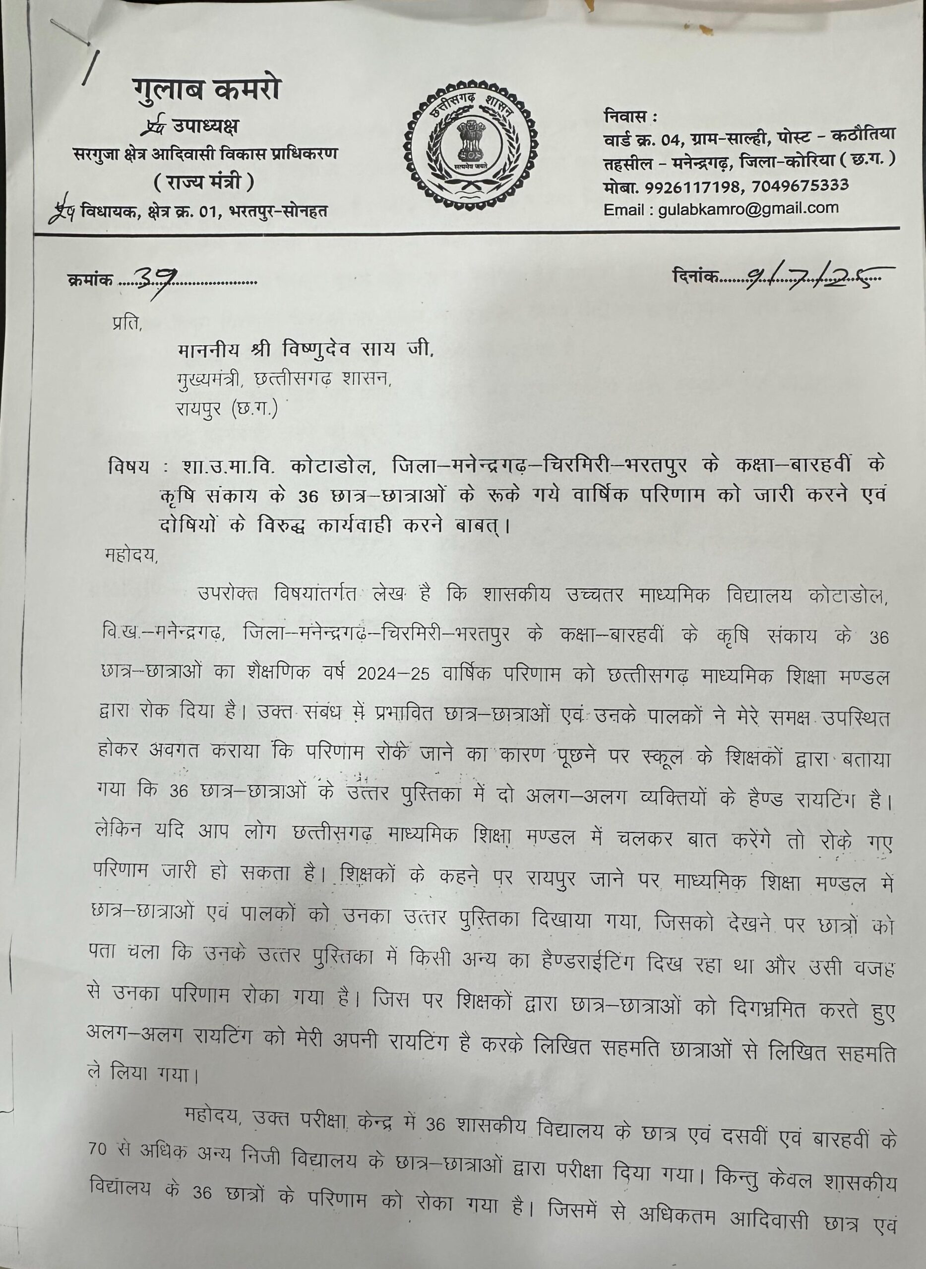 कोटाडोल शासकीय विद्यालय के 36 छात्र-छात्राओं का भविष्य अधर पूर्व विधायक गुलाब कमरों ने मुख्यमंत्री से उच्च स्तरीय जांच और कार्यवाही की मांग