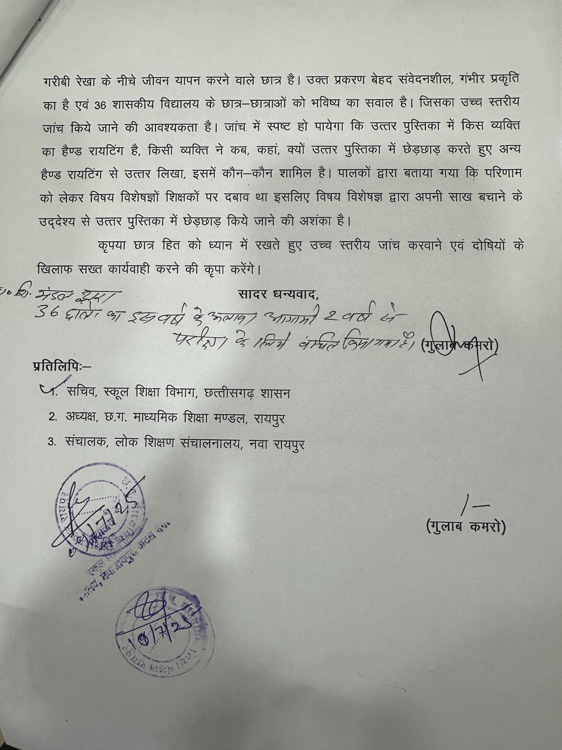 इस विषय में पूर्व विधायक गुलाब कमरों ने मुख्यमंत्री विष्णु देव साय को पत्र लिखकर यह कहा है कि मामला बेहद ही संवेदनशील और गंभीर है यह केवल शिक्षकों की पारदर्शिता पर प्रश्न चिह्न नहीं लगता बल्कि 36 गरीब आदिवासी छात्र-छात्राओं के भविष्य को बर्बाद करने जैसा है इस मामले की उच्च स्तरीय जांच कराई जाए जिससे यह पता चल सके कि उत्तर पुस्तिकाओं में किसके द्वारा छेड़छाड़ की एवं दोषियों के विरुद्ध कड़ी से कड़ी कार्रवाई की मांग भी की जाए