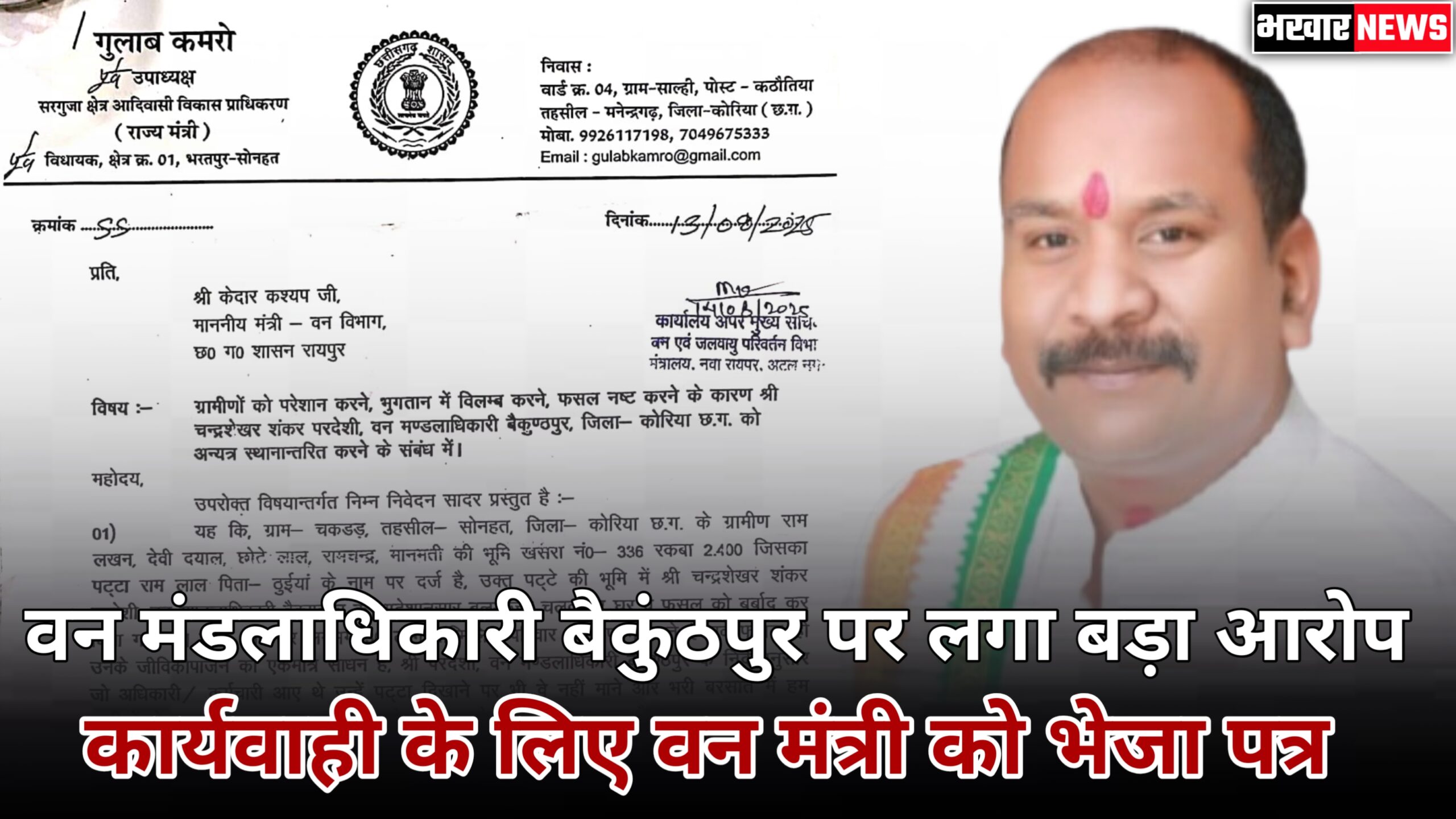 भखार न्यूज नेटवर्क: भरतपुर–सोनहत विधानसभा क्षेत्र के पूर्व विधायक गुलाब कमरों ने वन मंत्री केदार कश्यप को पत्र लिखकर बैकुंठपुर वन मंडलाधिकारी चन्द्रशेखर शंकर परदेशी पर गंभीर आरोप लगाए हैं।