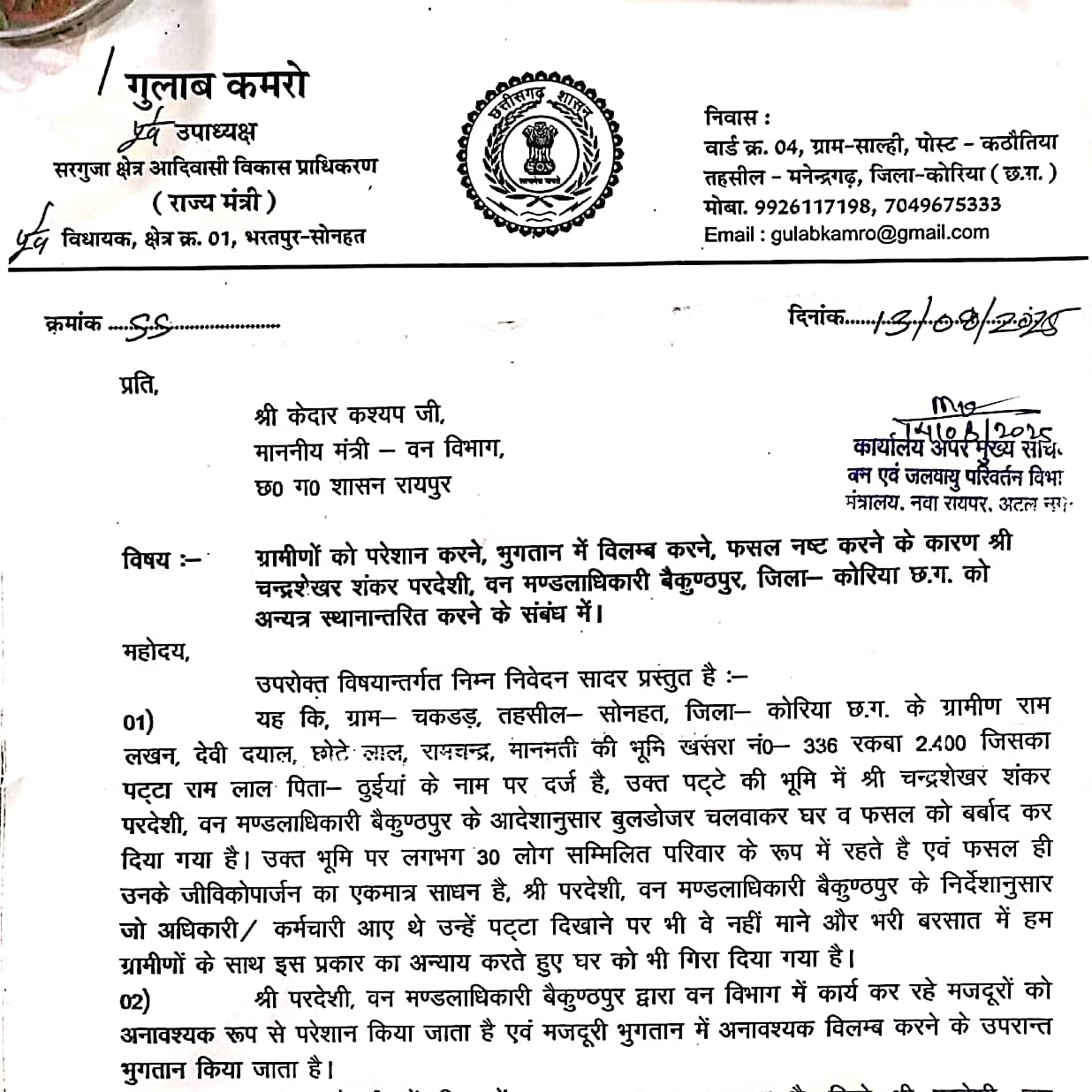 पूर्व विधायक गुलाब कमरों ने अपने पत्र में मांग की है कि ग्रामीणों को लगातार परेशान करने, मजदूरी भुगतान में विलंब करने और किसानों की फसल बर्बाद कराने जैसे मामलों की जांच की जाए तथा संबंधित अधिकारी के खिलाफ कार्यवाही करते हुए तत्काल स्थानांतरण किया जाए।