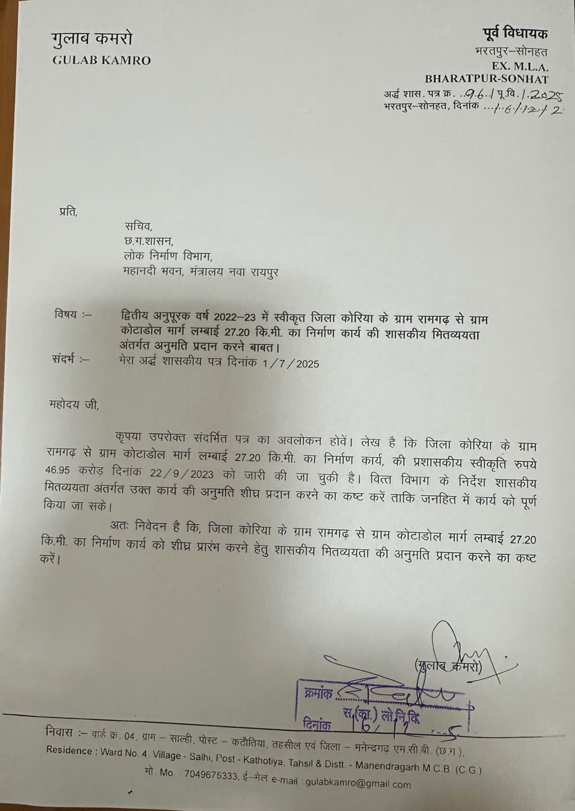 जिला कोरिया के विकासखंड सोनहत अंतर्गत ग्राम रामगढ़ से ग्राम कोटाडोल (27.20 किलोमीटर) मार्ग के निर्माण को लेकर बड़ा अपडेट सामने आया है। इस महत्वपूर्ण सड़क परियोजना को शीघ्र प्रारंभ कराने की मांग को लेकर पूर्व विधायक गुलाब कमरो ने लोक निर्माण विभाग के सचिव को पत्र लिखकर शासकीय मितव्ययता अंतर्गत अनुमति तत्काल प्रदान करने की मांग की है।