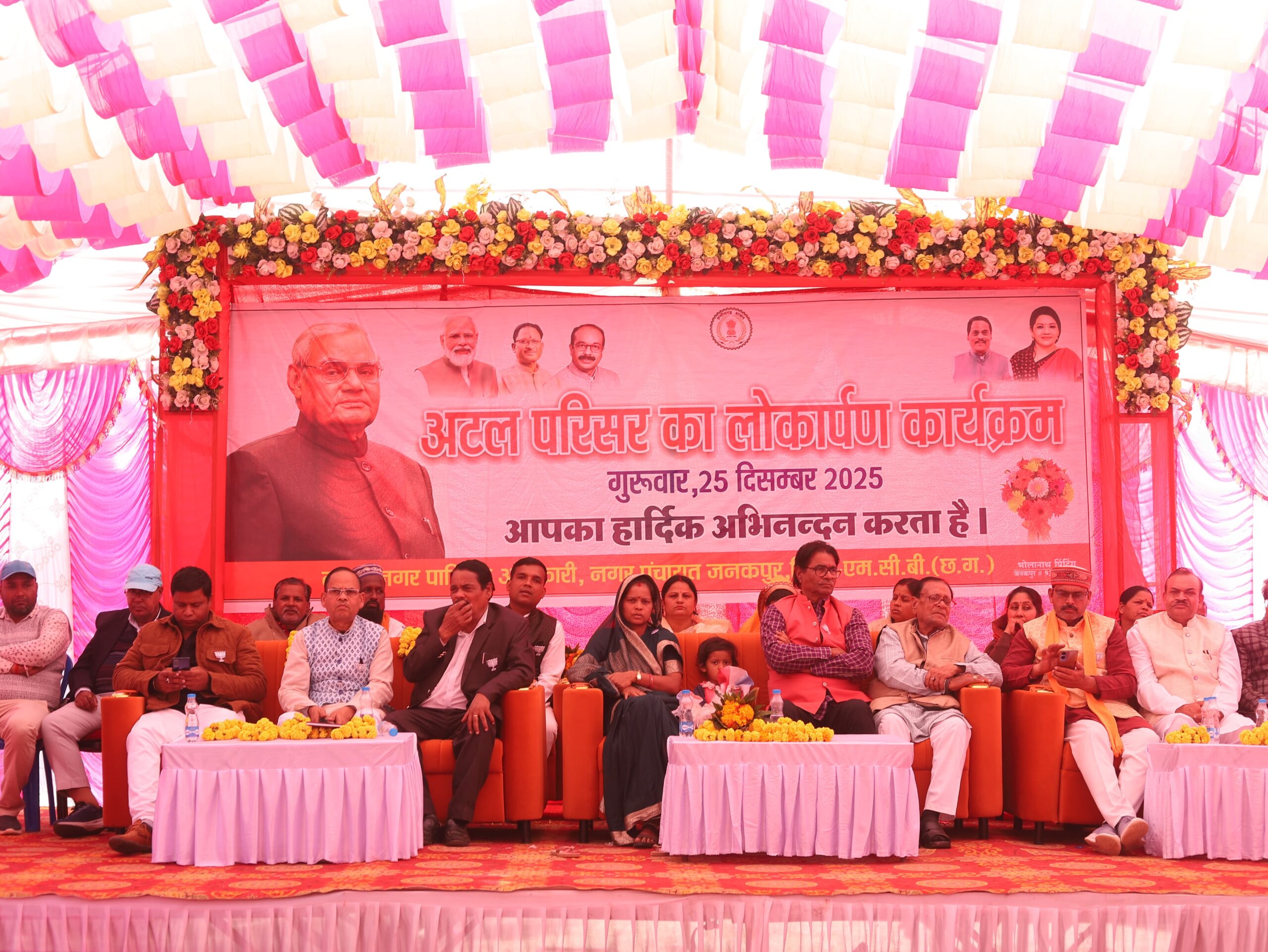 इस कार्यक्रम के दौरान अटल जी के चित्र पर माल्यार्पण कर उन्हें नमन किया गया तथा उनके राष्ट्र निर्माण, सुशासन और लोकतांत्रिक मूल्यों में दिए गए अतुलनीय योगदान को स्मरण किया गया। आज दिनांक 25 दिसंबर दिन गुरुवार को आयोजित कार्यक्रम में नगर पंचायत जनकपुर में नवनिर्मित अटल परिसर का भव्य वर्चुअल लोकार्पण तथा स्वर्गीय श्री अटल बिहारी वाजपेयी की प्रतिमा का विधिवत अनावरण समारोह पूर्वक संपन्न हुआ।