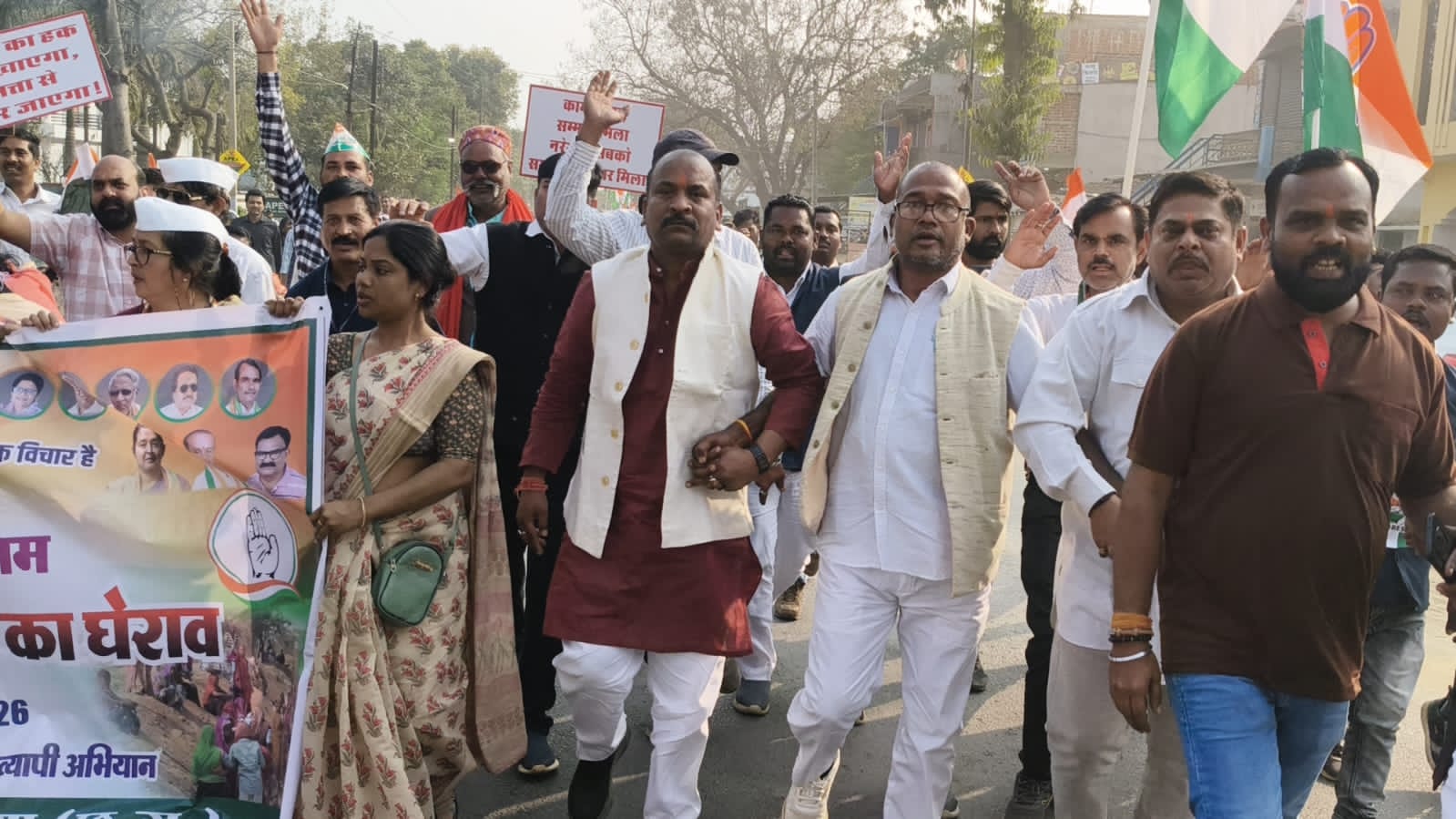 भखार न्यूज नेटवर्क: अखिल भारतीय कांग्रेस कमेटी के आह्वान पर चल रहे “मनरेगा बचाओ संग्राम” अभियान के तहत आज जिला कांग्रेस कमेटी कोरिया के तत्वावधान में जिला मुख्यालय बैकुंठपुर में कांग्रेस पार्टी द्वारा धरना-प्रदर्शन, आमसभा एवं कलेक्टर कार्यालय का घेराव किया गया। कार्यक्रम में बड़ी संख्या में कांग्रेस नेता, पदाधिकारी, कार्यकर्ता एवं आम नागरिक शामिल हुए।