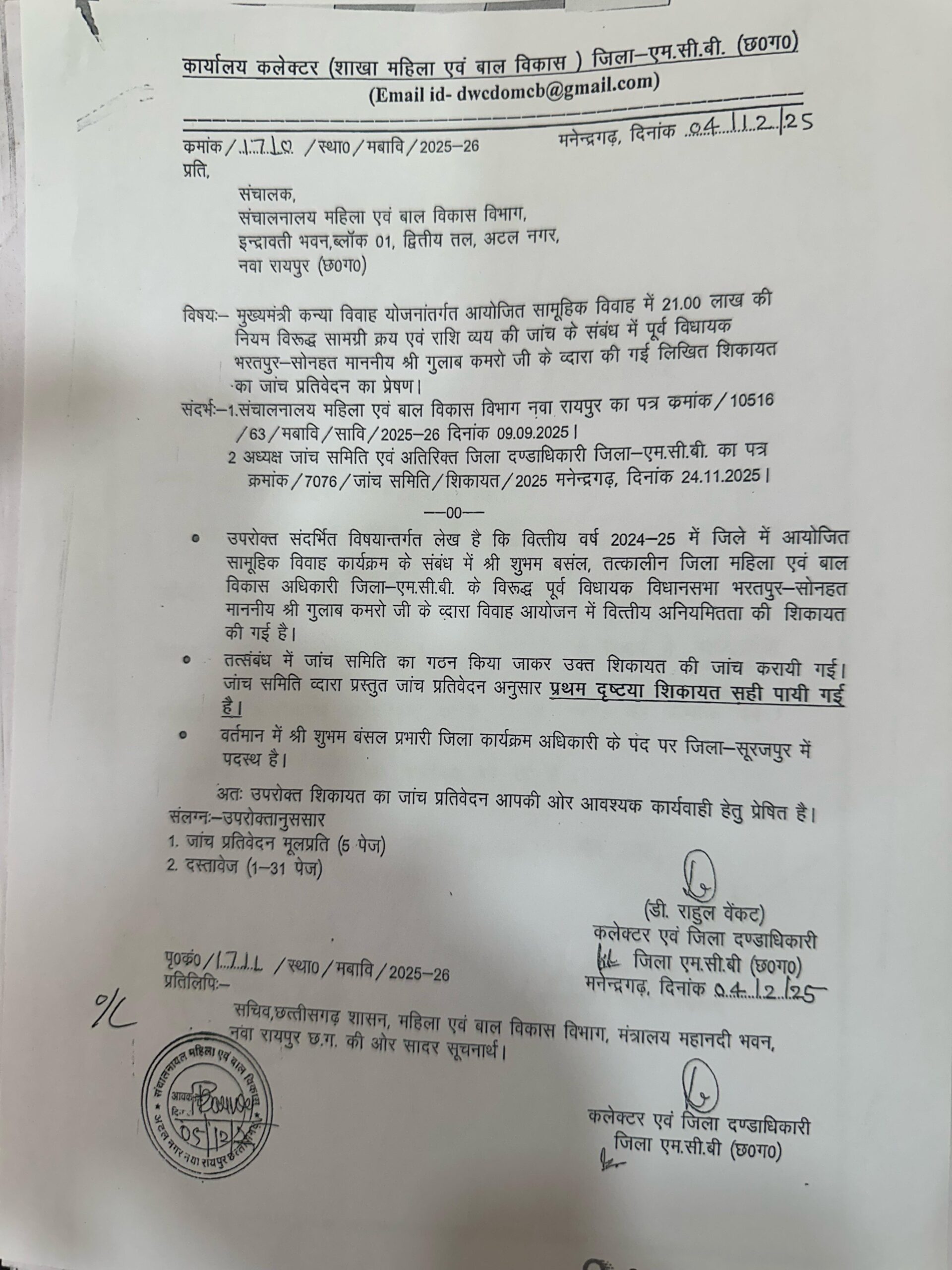 इस मामले में भरतपुर-सोनहत के पूर्व विधायक गुलाब कमरो द्वारा की गई शिकायत की जांच में प्रथम दृष्टया आरोप सही पाए गए हैं, लेकिन इसके बावजूद अब तक किसी भी जिम्मेदार अधिकारी पर ठोस कार्रवाई नहीं होना कई सवाल खड़े कर रहा है।